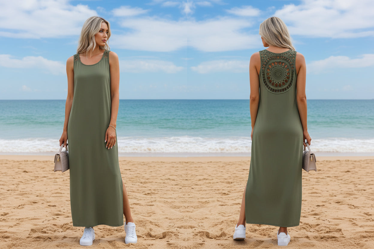 This sleeveless dress embodies the lightness and freshness of the sacred nectar Amrita , symbolizing immortality and purity . With a loose A-line cut and ankle-length hem , it's perfect for those seeking comfort and style for any occasion.
