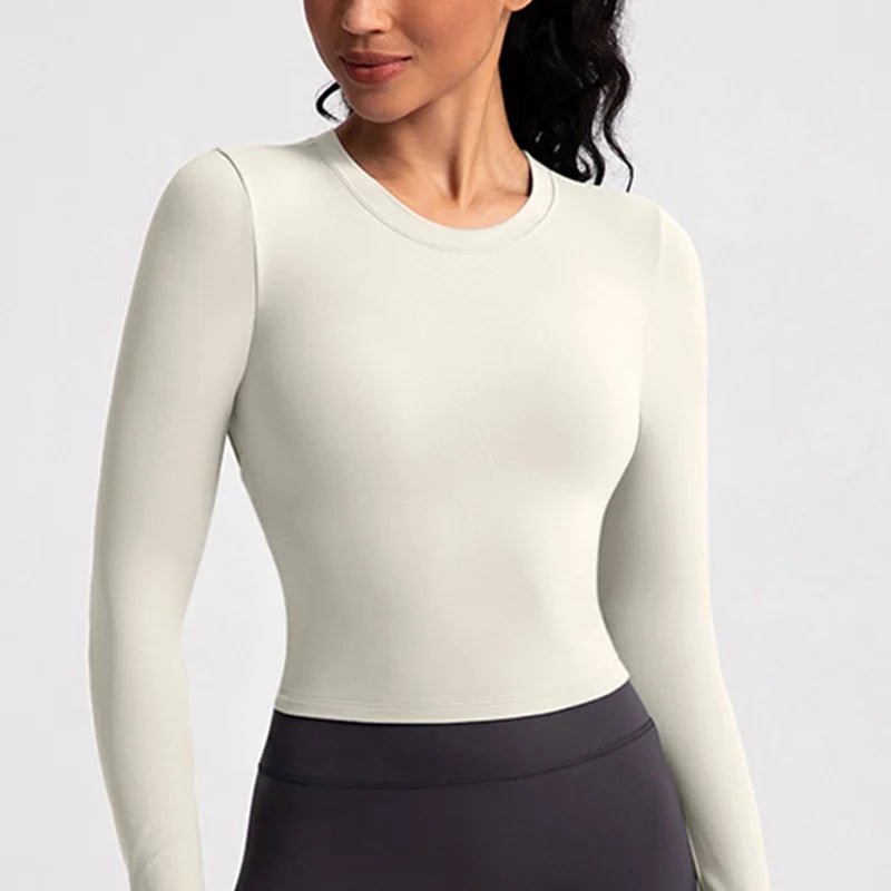 Made from high-performance knitted fabric, with a blend of nylon and elastane, it offers balanced elasticity, a soft touch, and a comfortable fit. The slim fit enhances the silhouette without restricting movement, while the long sleeves provide light coverage, ideal for warm-ups, yoga, running, or functional training.