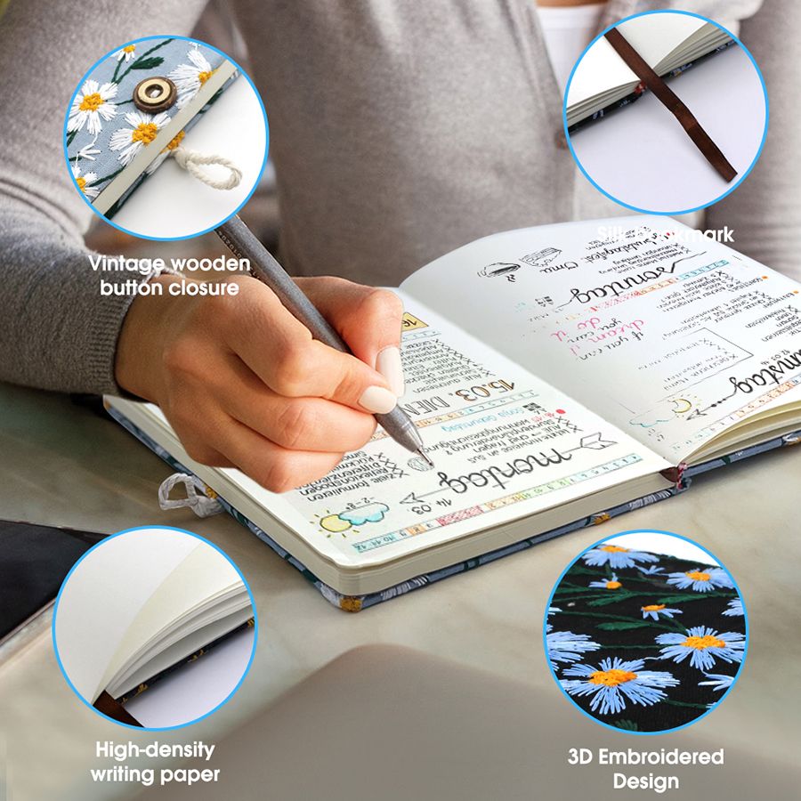 Com um design delicado e artesanal, o Shama Notes combina beleza e funcionalidade. A capa bordada com padrões florais evoca harmonia e criatividade, enquanto o acabamento em tecido traz uma textura suave e natural ao toque. O marcador integrado permite-te retomar o teu fluxo de ideias onde o deixaste — como um fio que liga cada pensamento ao próximo.