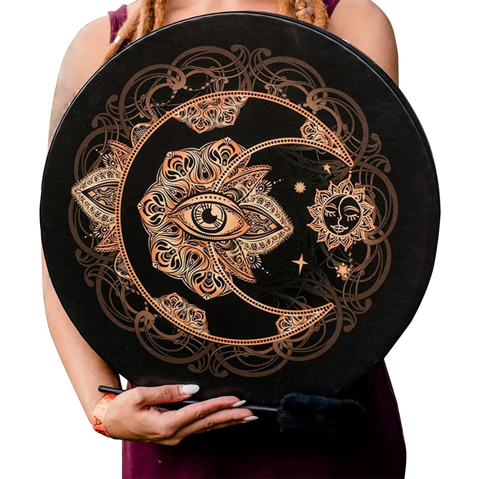 - Versatilidade e Estilo: Além de sua função terapêutica, o Tambor de Mão Xamânico Sagrado pode ser usado como um instrumento musical e como um acessório elegante para sessões de meditação ou yoga.